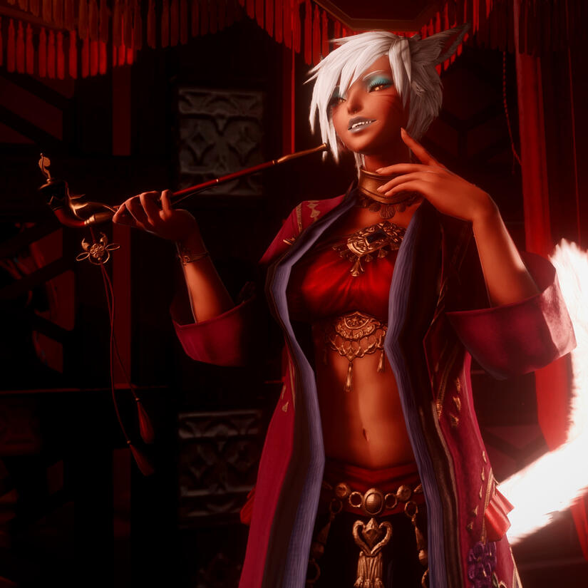 After running away from her clan in Sagolii Desert, young L'suuni 'Sunny' Khaaz lived on the streets of Ul'dah for a time. Taking up the oldest of occupations in the worst of environments, Sunny managed to catch the attention of a Mistress of a local brothel. There she was cleaned, fed, and taught the ways of a courtesan. Over the years her skill made her one of notice, to a point where she went freelance and eventually came into occupation of the Wish. Where she climbed the ladder with her confidence, forward energy, and professional skill in the art of adult entertainment to become the head of Courtesans, Madame L'suuni. Expect to walk away smiling in her presence, as she would ensure it, if you play nice.
